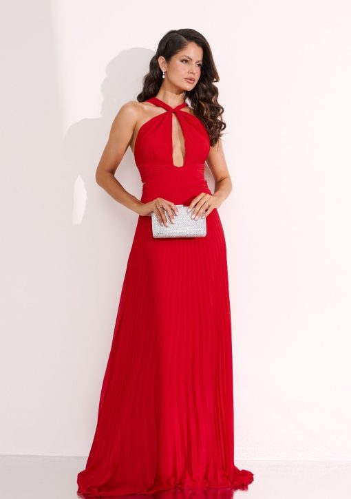 Vestido longo vermelho confeccionado em crepe. Modelo de frente única com decote, transpasse na cintura e todo plissado e com drapeados.