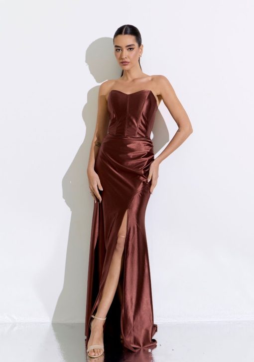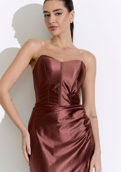 Vestido longo marrom confeccionado em tecido acetinado brilhoso. Modelo de tomara que caia com corset estruturado de decote coração, drapeados e fenda lateral.