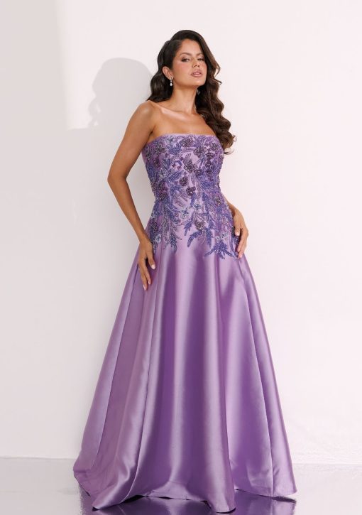 Vestido longo lavanda confeccionado em alfaiataria de zibeline. Modelo tomara que caia estruturado em corset, com bordados aplicados à mão em cristais e saia ampla.