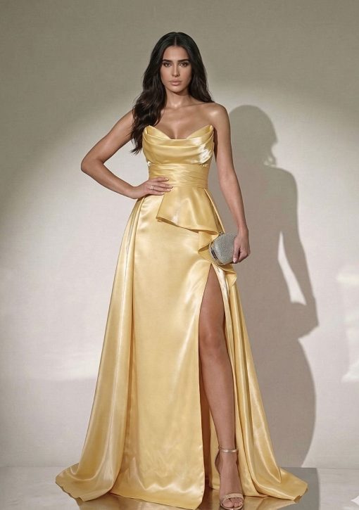 Vestido longo amarelo confeccionado em alfaiataria de zibeline glow. Modelo de tomara que caia, drapeados no busto, corset, babado lateral com fenda e cauda traseira.
