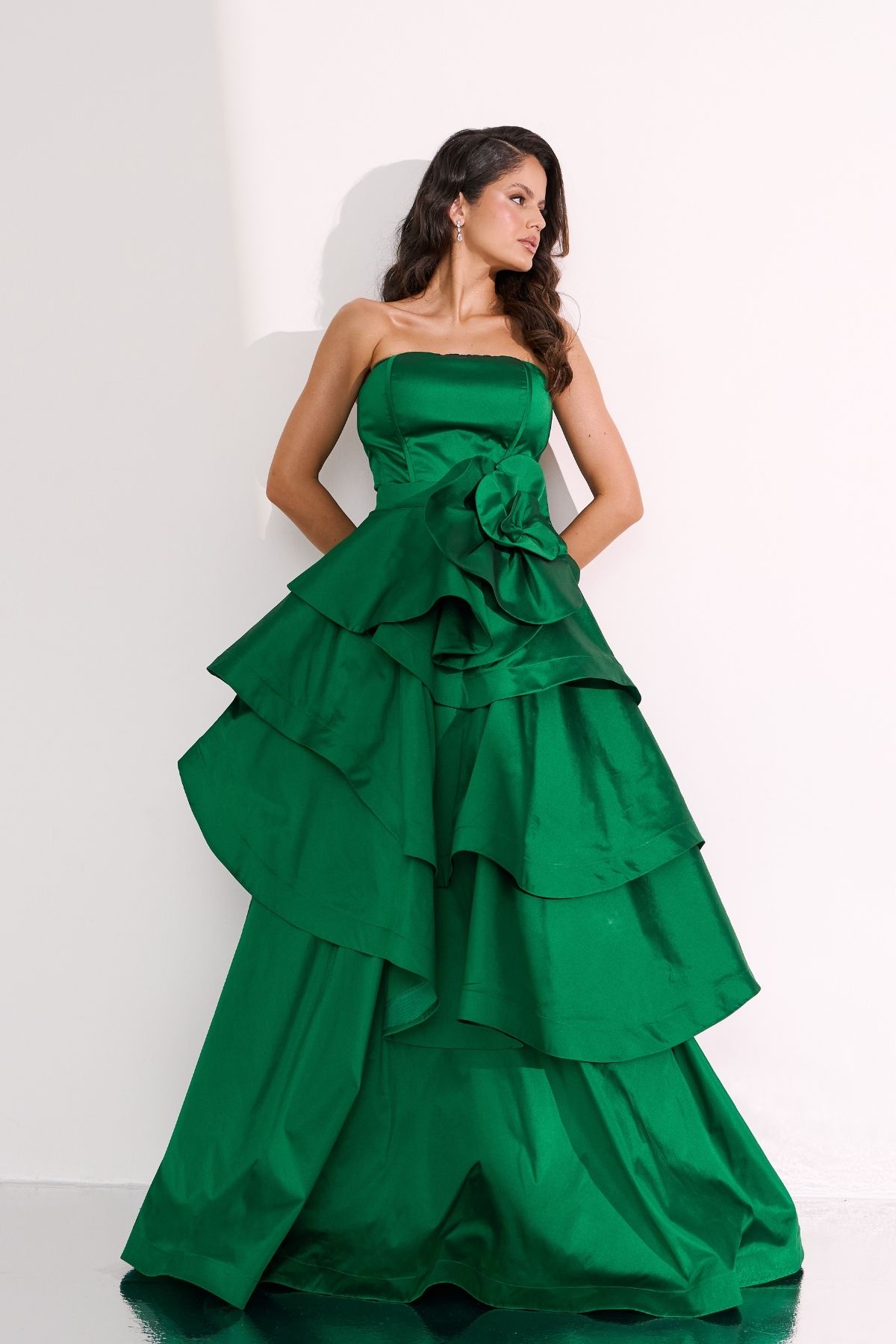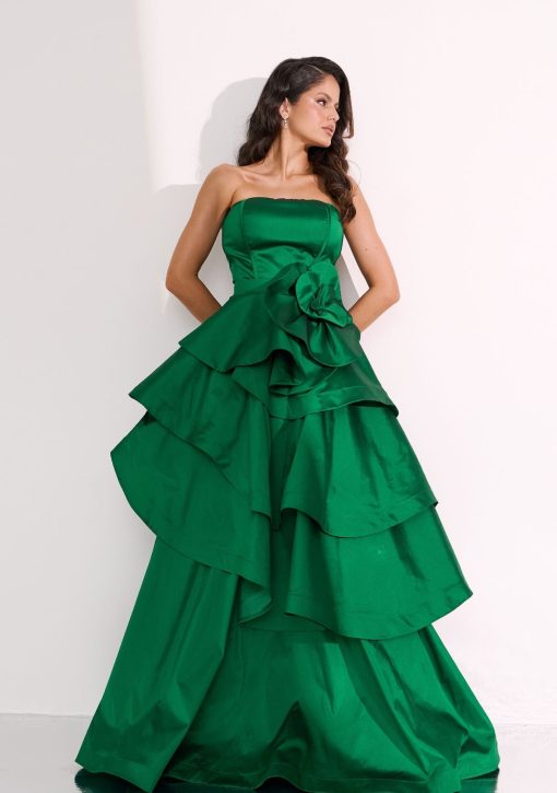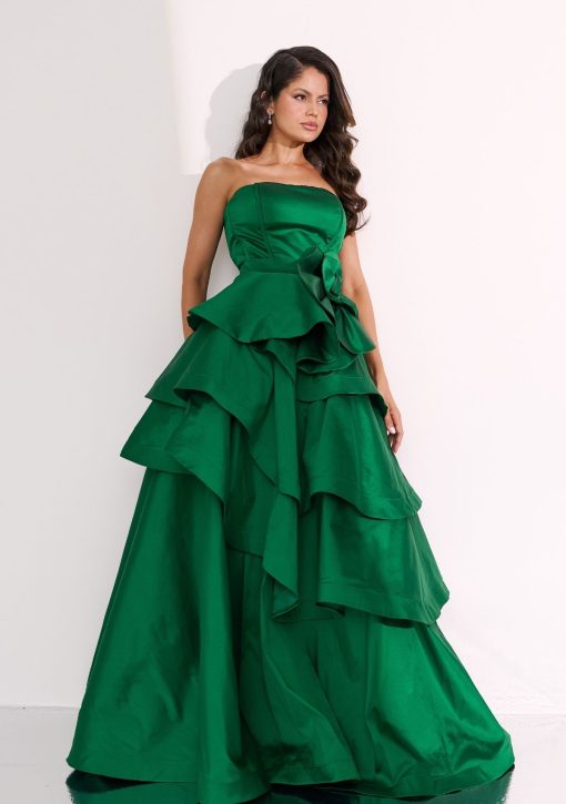 Vestido longo verde confeccionado em alfaiataria de tafetá de seda. Modelo de tomara que caia, corset estruturado, saia de camadas de babados super volumosa.