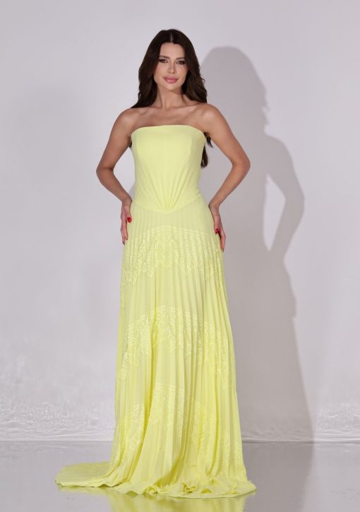Vestido longo amarelo confeccionado em tecido fluído. Modelo tomara que caia, modelagem corset alongado e estruturado, com saia plissada e aplicação de renda.