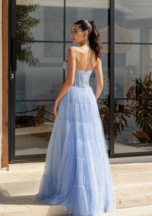 Vestido longo azul serenity confeccionado em tule italiano com bordados manuais de cristais. Modelo tomara que caia de modelagem corset estruturado.