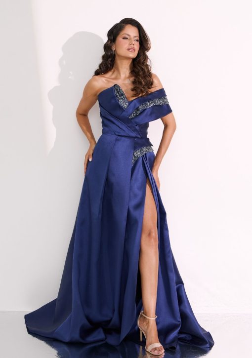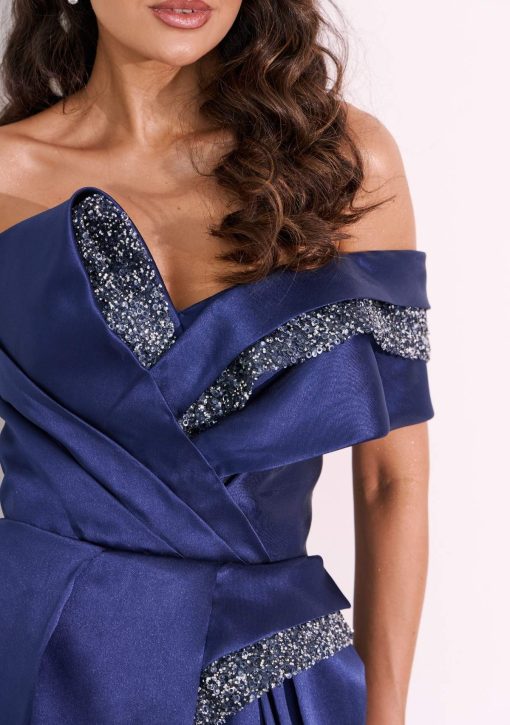 Vestido longo azul marinho confeccionado em alfaiataria de zibeline com tule de cristais. Modelo de ombro só com manga, drapeados assimétricos, e fenda lateral.