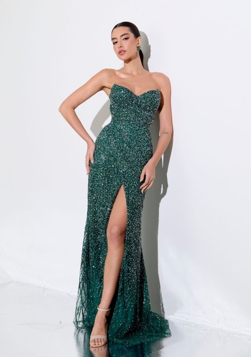 Vestido longo verde esmeralda confeccionado em tule glitterizado com cristais. Modelo de tomara que caia de corset estruturado, com decote moderno e fenda lateral.