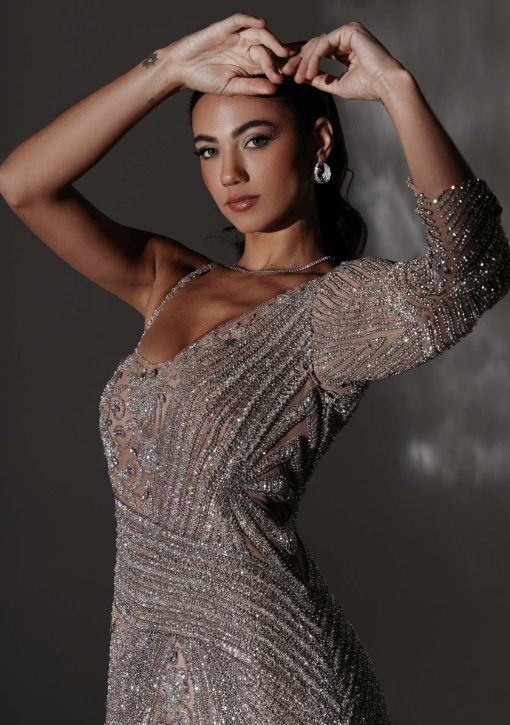 Vestido longo prata confeccionado em tule bordado à mão em pedrarias de cristais. Modelo de alças, com fenda lateral e design moderno.