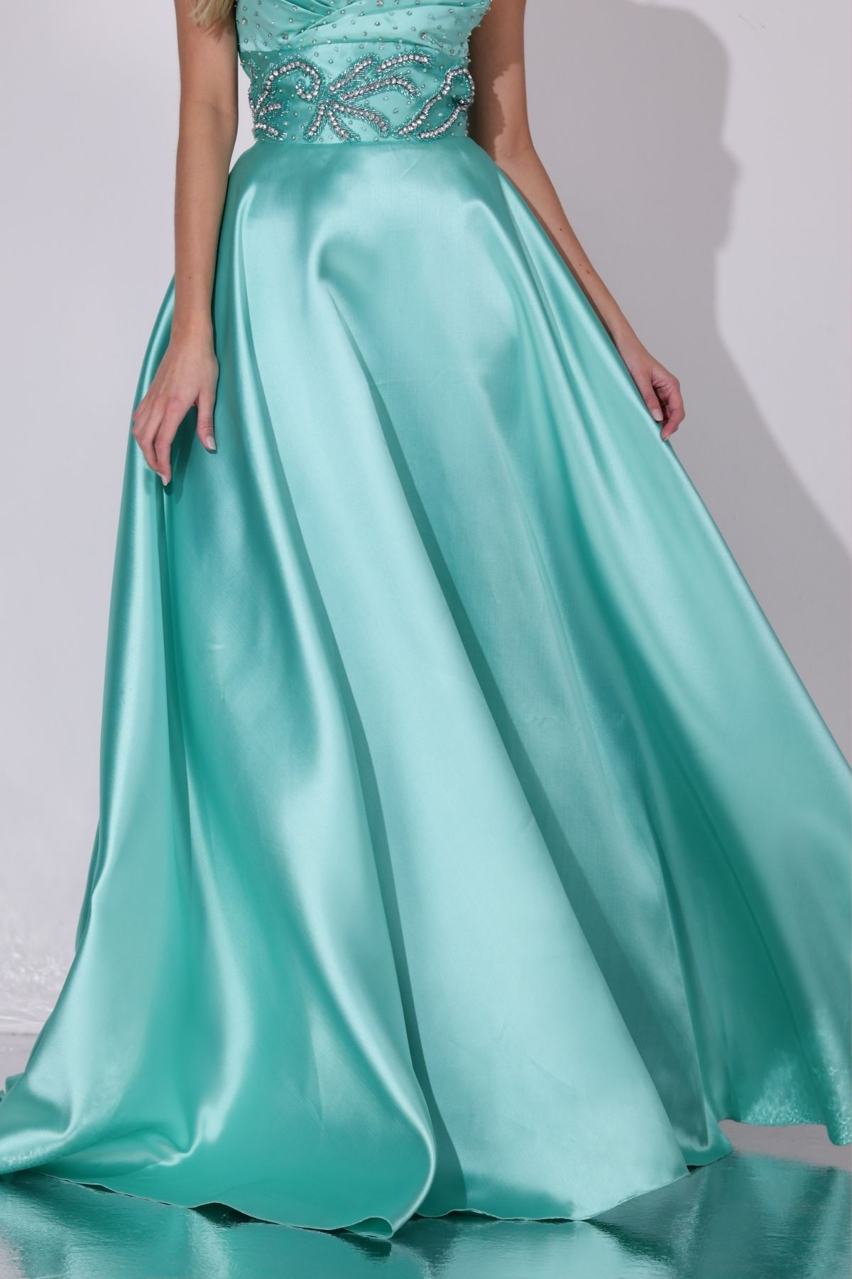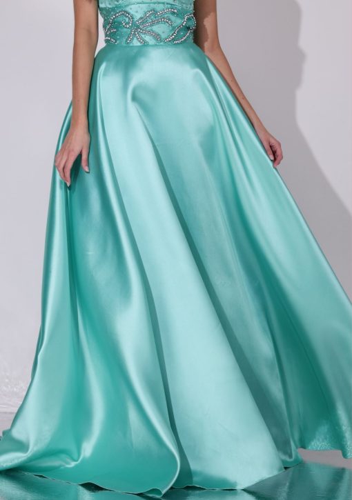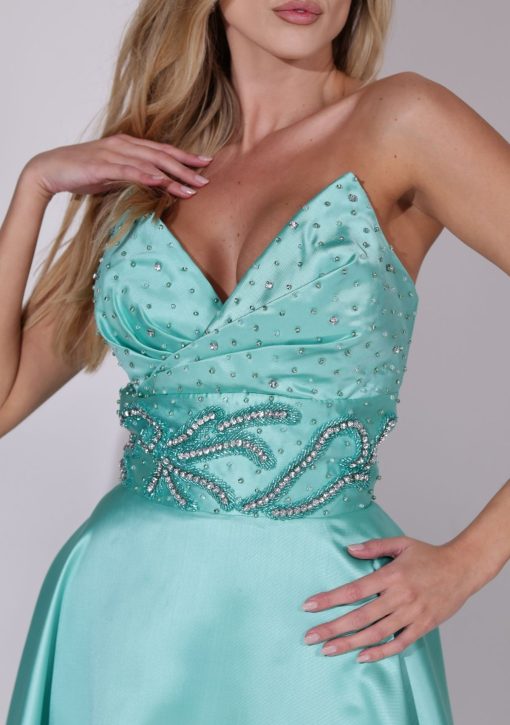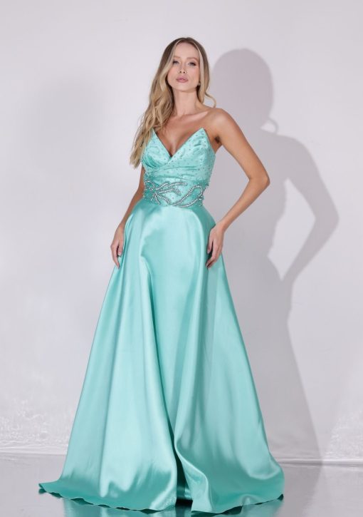 Vestido longo verde tiffany em alfaiataria zibeline. Modelo de tomara que caia com decote coração, com aplicação de bordado manuais em pérolas e cristais.