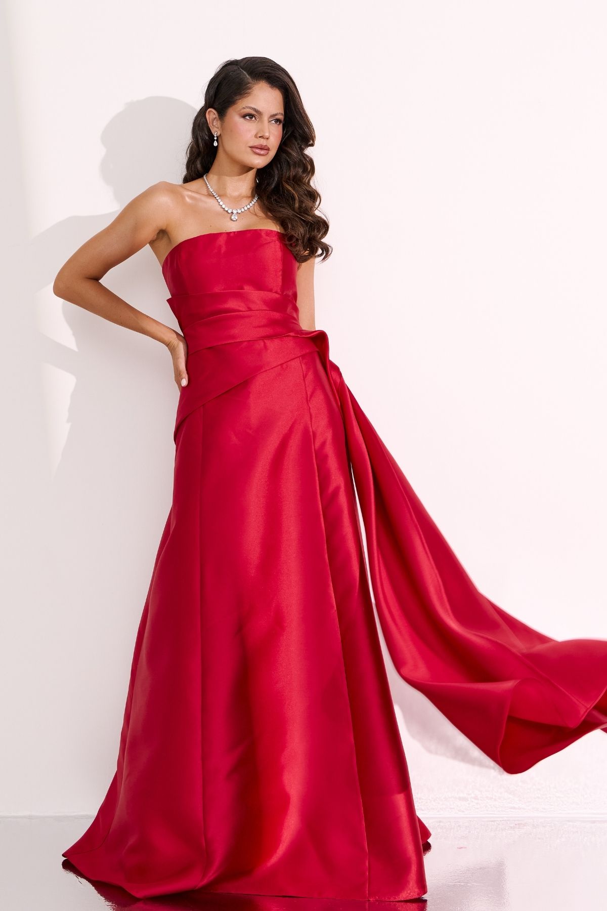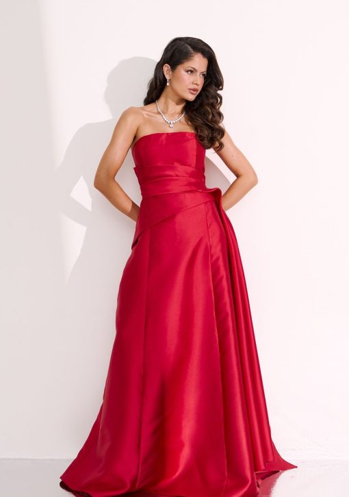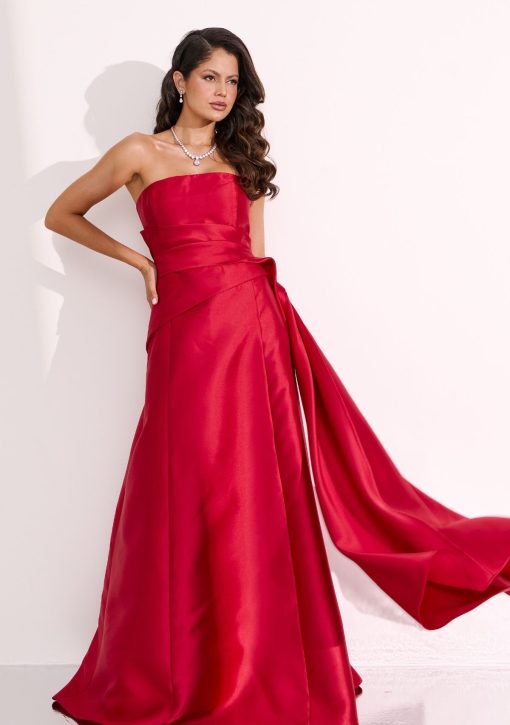Vestido longo vermelho confeccionado em alfaiataria de zibeline. Modelo tomara que caia, decote reto, drapeados assimétricos.