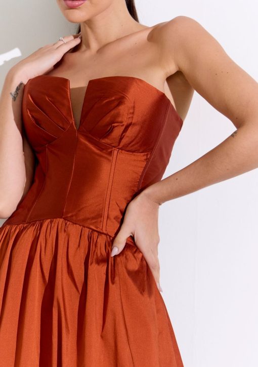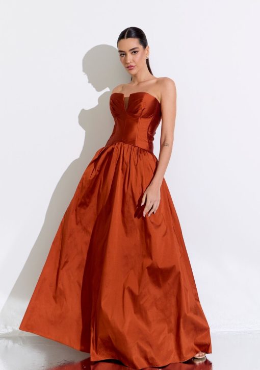 Vestido longo terracota confeccionado em alfaiataria de tafetá. Modelo de tomara que caia, de corset alongado estilo cintura baixa, e saia ampla.