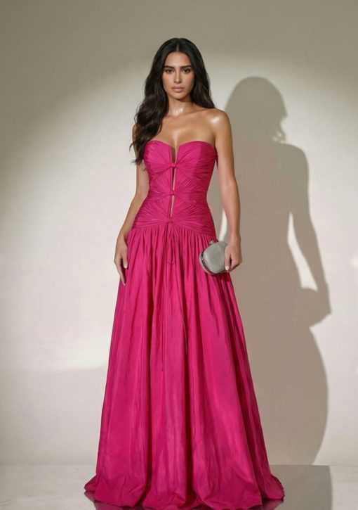 Vestido longo rosa pink confeccionado em alfaiatria de tafetá. Modelo de tomara que caia, decote profundo, entralaços no busto, corset cintura baixa e saia ampla.