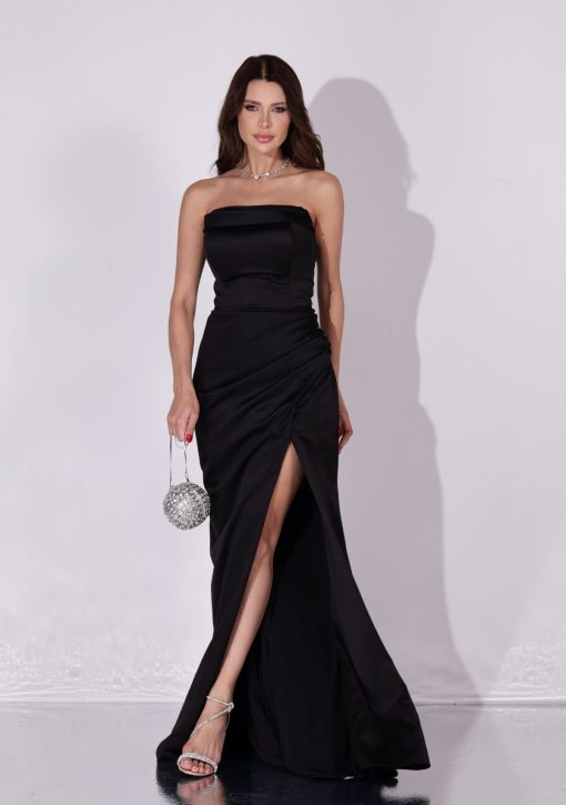 Vestido longo preto confeccionado em alfaiataria. Modelo de tomara que caia, corset estruturado, com fenda lateral.