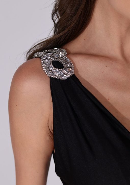 Vestido longo preto confeccionado em jersey. Modelo de alças largas com decote profundo, drapeado na cintura e detalhe de strass no ombro.