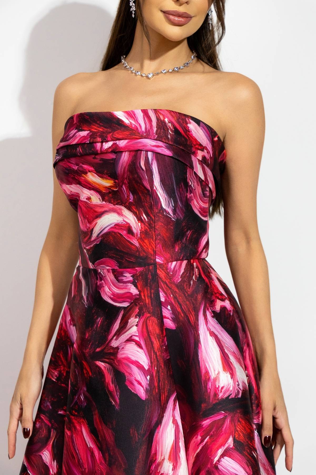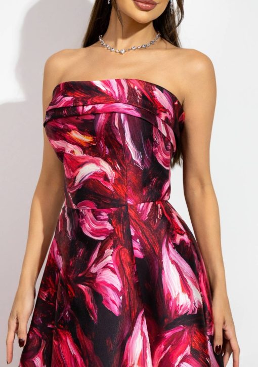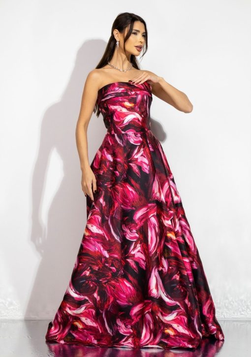 Vestido longo estamapado moderno confeccionado em alfaiataria refinada de zibeline. Modelo de tomara que caia, corset e detalhe de pala em cima.