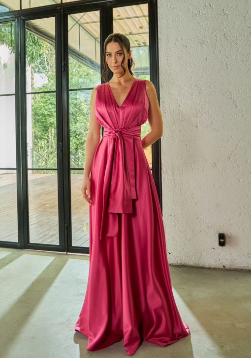 Vestido longo rosa confeccionado em tecido confortável. Modelo de alças largas, com decote em “V” com amarração na cintura.