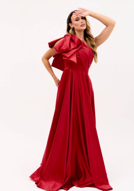 Vestido longo vermelho confeccionado em alfaiataria de zibeline. Modelo de um ombro só com maxi laço aplicado (opcional).