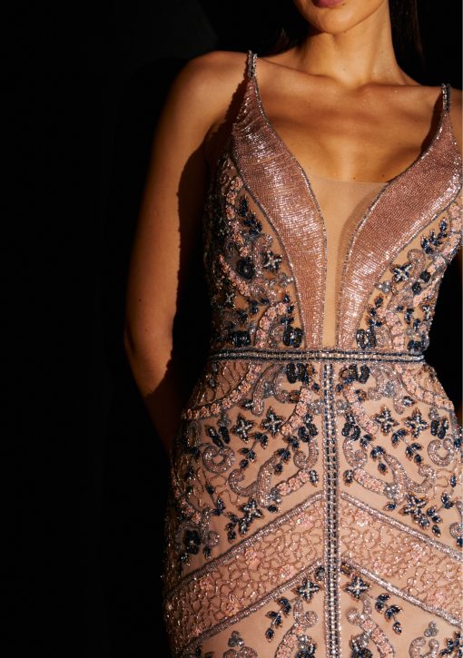 Vestido longo rosê inteiro bordado à mão em vidrilhos. Modelo de alças finas com decote em “V” e fenda central.