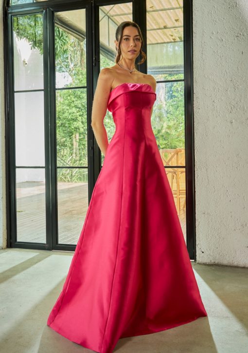 Vestido longo rosa pink confeccionado em alfaiataria zibeline com detalhe no busto feito de organza liquida. Modelo de saia ampla e tomara que caia.