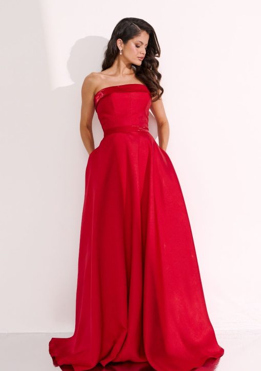 Vestido longo vermelho confeccionado em alfaiataria de zibeline. Modelo de tomara que caia, decote reto e saia ampla, detalhes de pala e cinto com tecido de zibeline glow cristal.