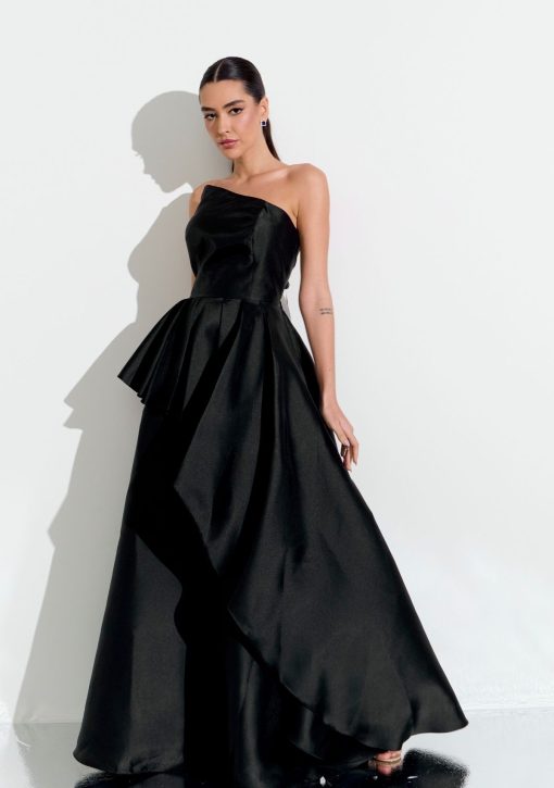 Vestido longo preto confeccionado em alfaiataria zibeline. Modelo de tomara que caia com decote assimétrico, drapeado e saia sobreposta assimétrica.