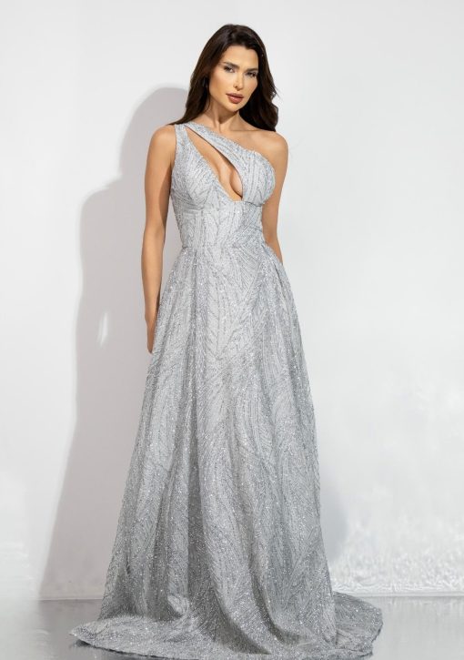 Vestido longo prata confeccionado em tule glitterizado. Modelo de ombro só, com decote assimétrico e saia ampla.
