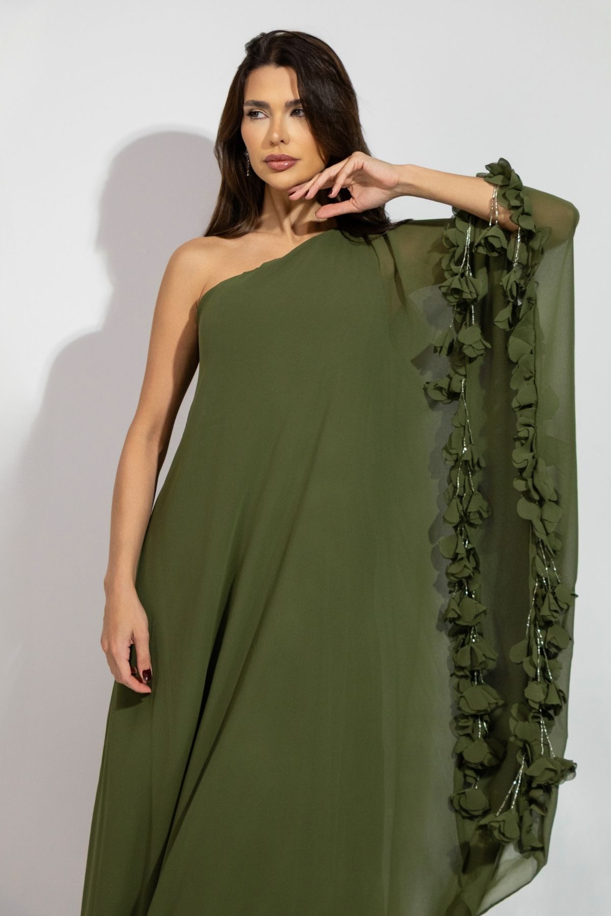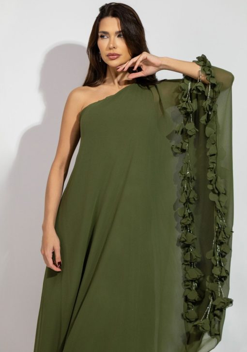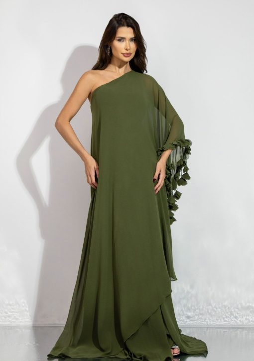Vestido longo verde oliva confeccionado em crepe musseline todo fluído. Modelo de ombro só, com manga capa fluída e aplicação de flores.