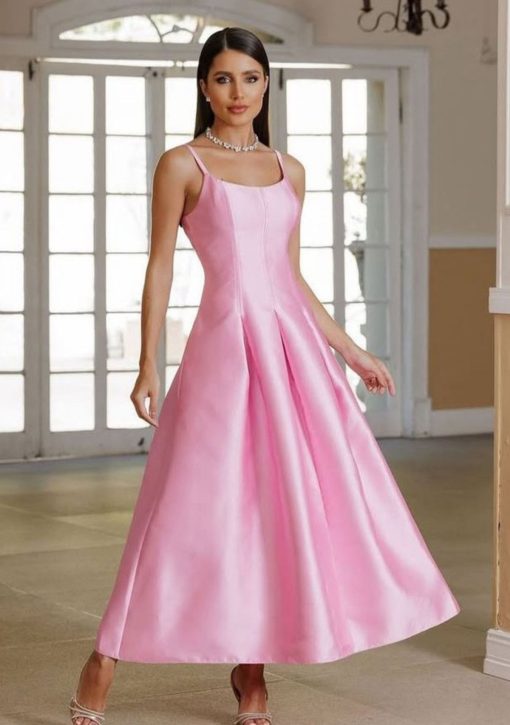 Vestido midi/longo rose/rosa claro confeccionado em alfaiataria de zibeline. Modelo de alças, decote quadrado, e saia ampla.