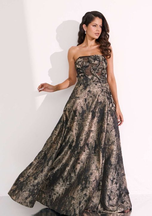 Vestido longo estampado (preto e chumbo cobre) confeccionado em alfaiataria de jacquard. Modelo de tomara que caia, corset estruturado e desenho de flores alto relevo.