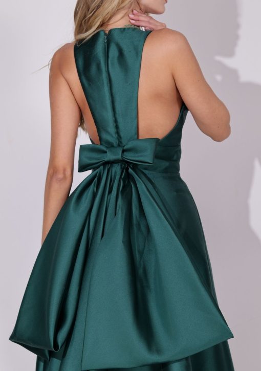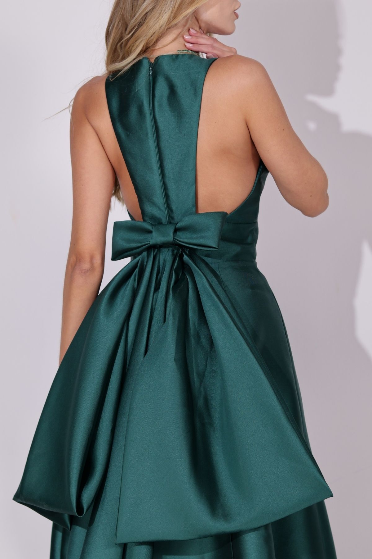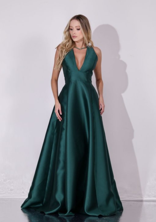 Vestido longo verde esmeralda confeccionado em alfaiataria de zibeline. Modelo de alças largas, decote profundo, saia ampla e costas abertas com detalhe de laço.